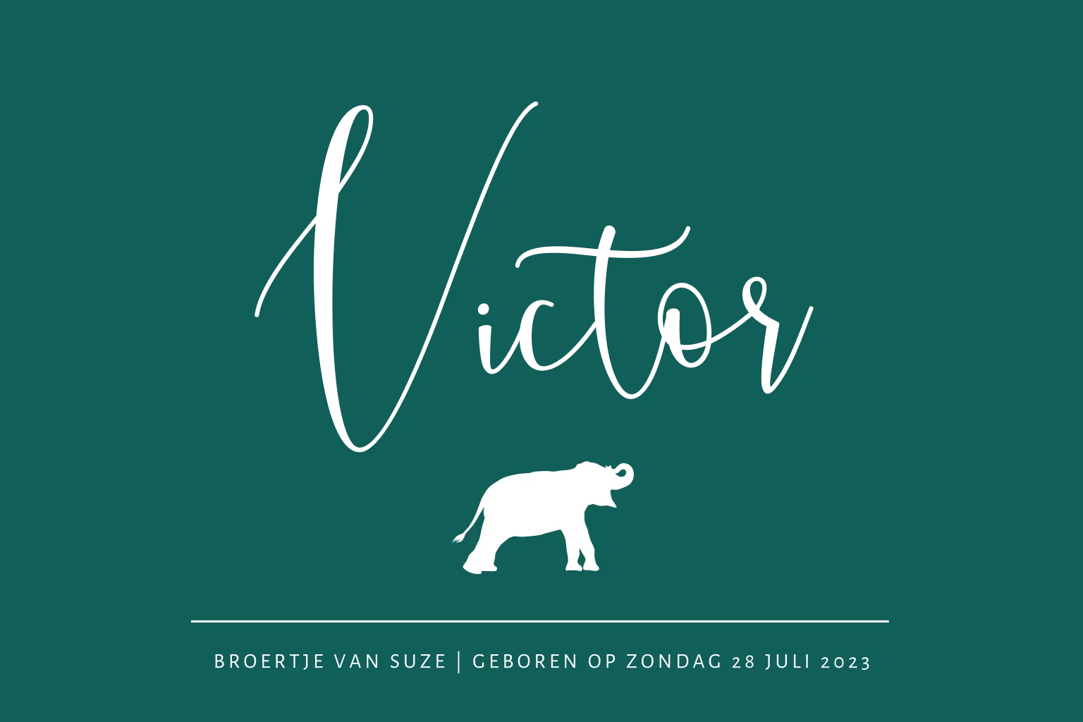 Exclusief geboortekaartje voor een jongen met foliedruk. Dit kaartje met de babynaam Victor heeft een donkergroene achtergrond en een silhouet van een olifant. De naam wordt gedrukt met echt goudfolie en springt er op deze kaart helemaal uit. De kleuren en het silhouet zijn gemakkelijk aan te passen. Ook mogelijk met koperfolie, zilverfolie of roséfolie.