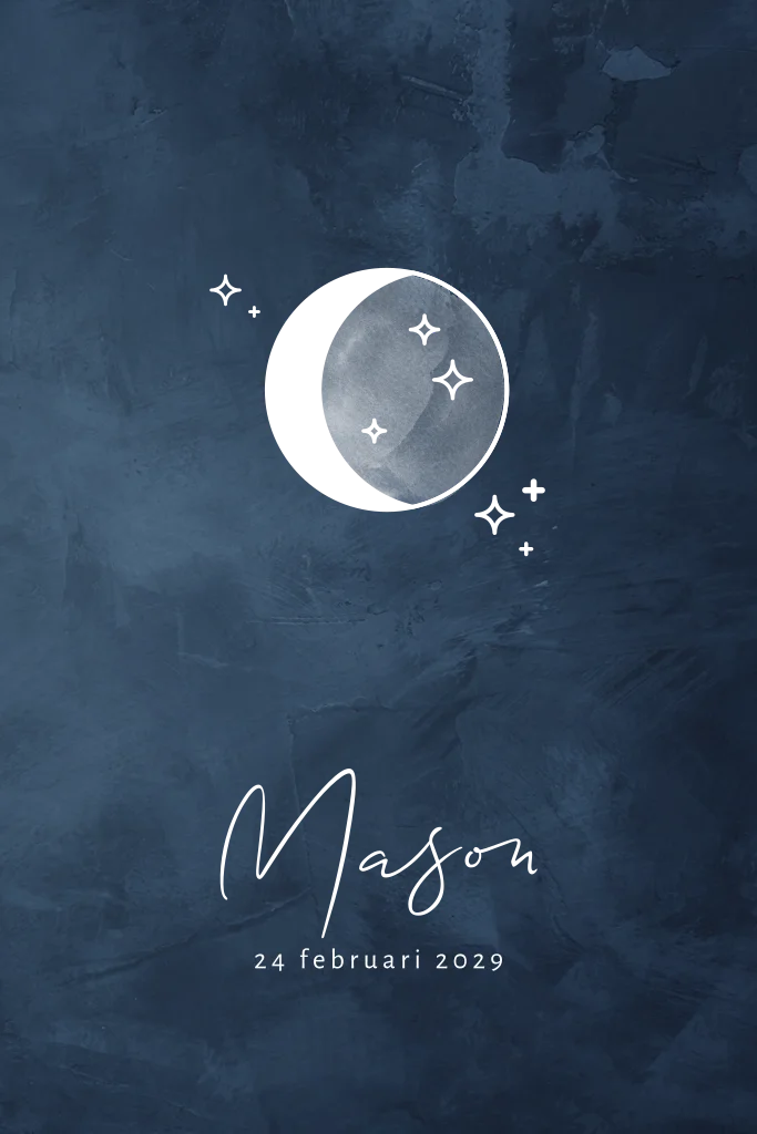 Rondhoek geboortekaartje voor een jongen met maan en sterretjes. Dit babykaartje Mason is voorzien van goudfolie, wat een super-de-luxe uitstraling geeft. De goudfolie van de sterren en de maan, in combinatie met de donkerblauwe achtergrond, geeft een schitterend nachtelijk sfeertje. Teksten en (folie)kleuren pas je eenvoudig aan in onze ontwerpmodule. Vragen? We helpen je graag!