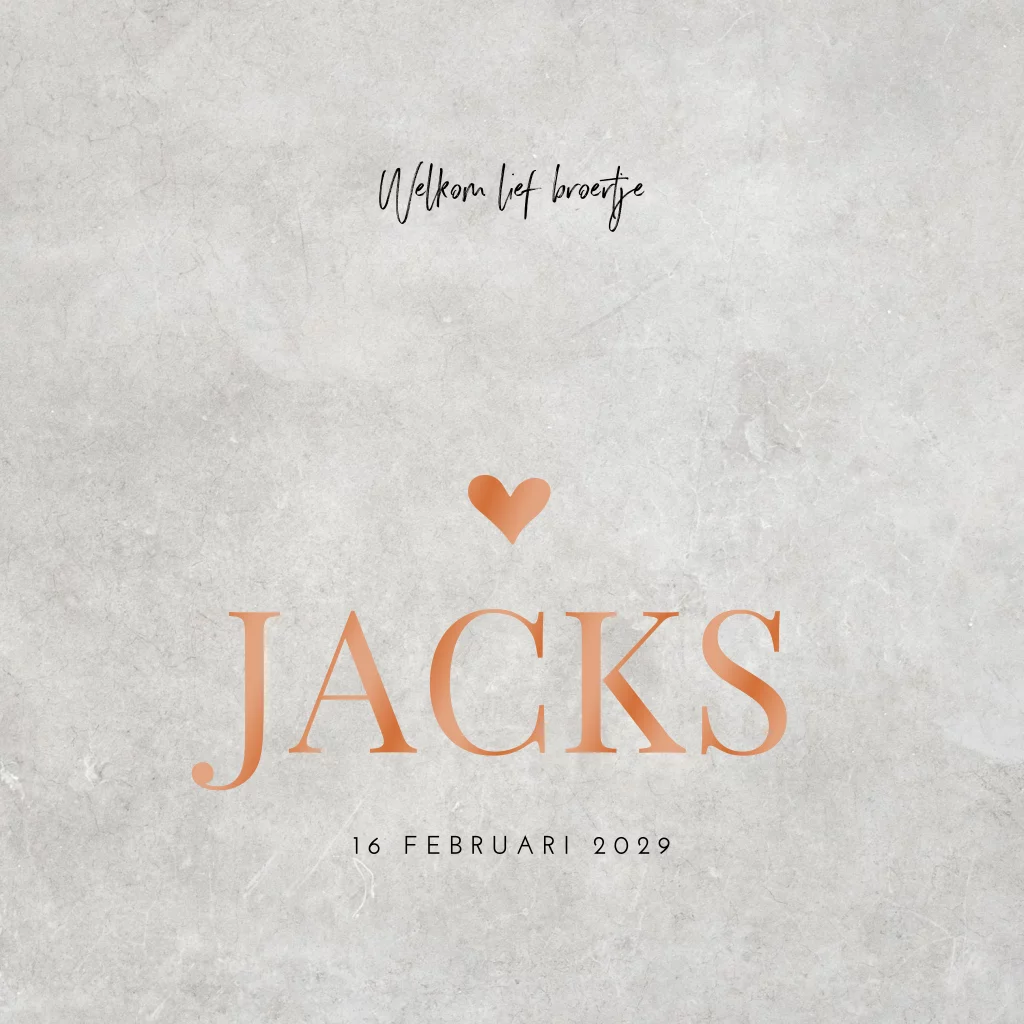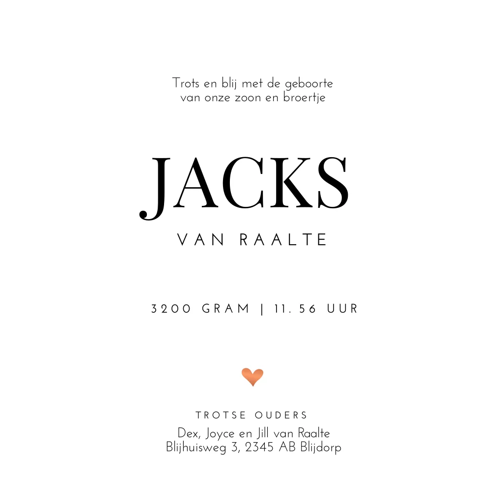 Basic geboortekaartje voor een jongen met hoogglans en een hartje. Dit kaartje Jacks heeft een basic design, maar doordat de babynaam en het hartje op de voor- en achterzijde van dit kaartje gedrukt worden in hoogglans, krijgt de kaart een luxe uitstraling. Je kunt de kleur eenvoudig aanpassen naar goudfolie, zilverfolie of roséfolie.