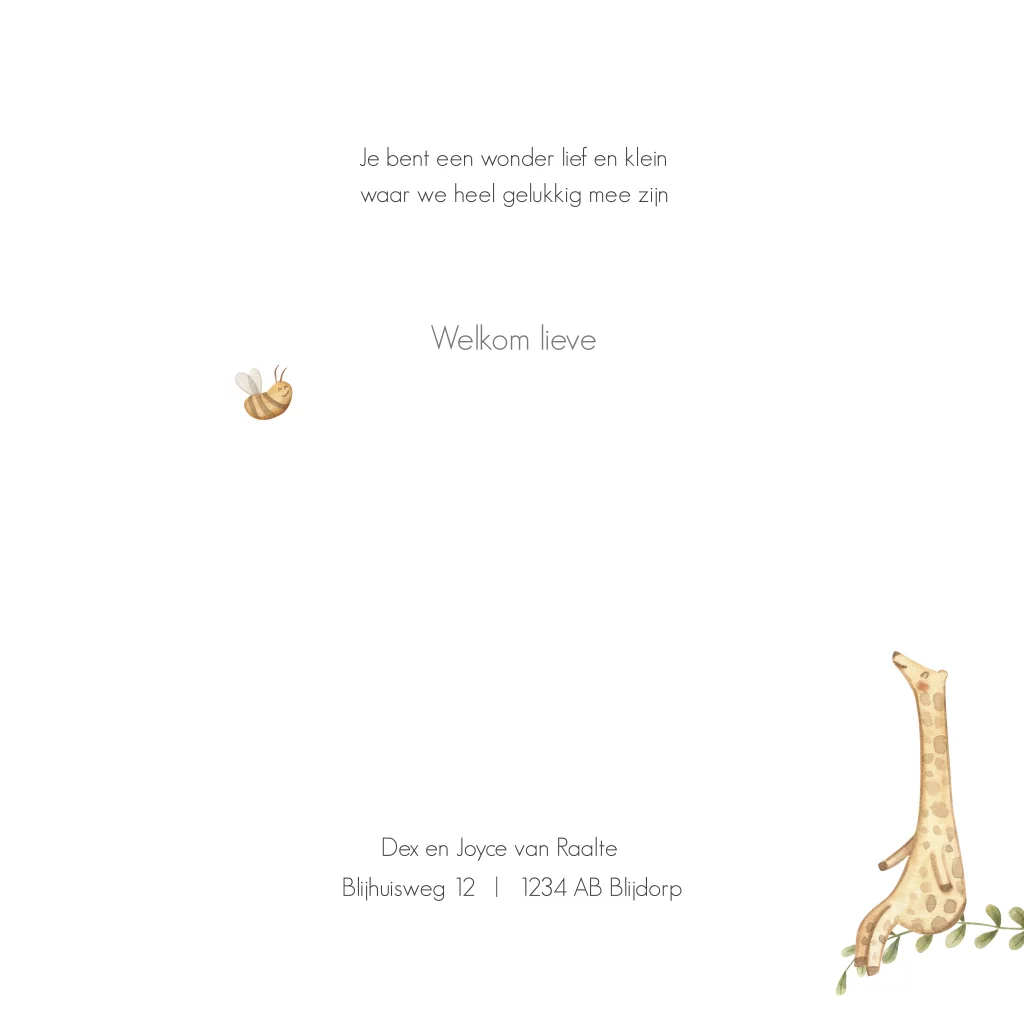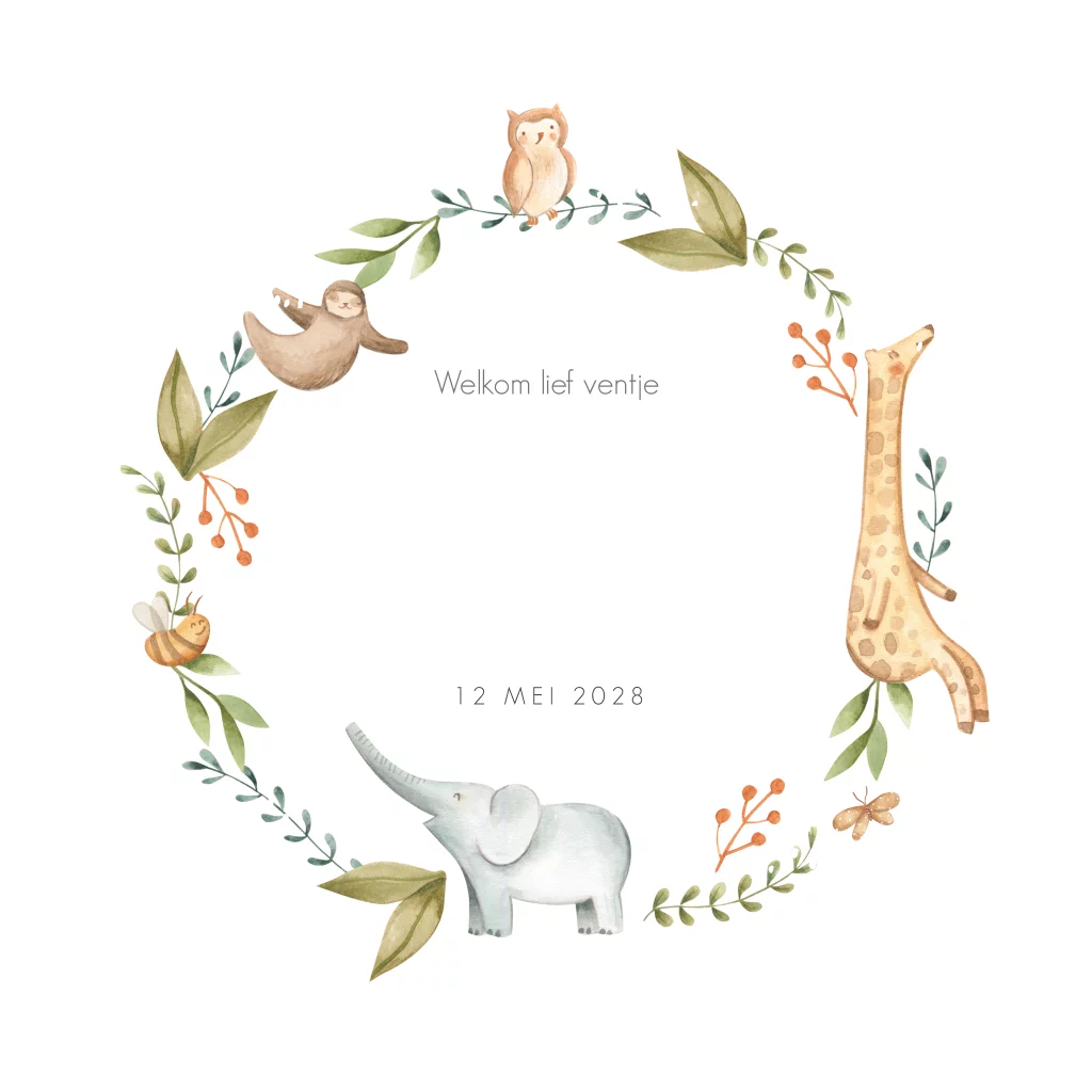 Lief geboortekaartje voor een jongen met verschillende vrolijke dieren in een cirkel, waaronder een olifantje, luiaard, giraffe, uil en vlinder. Wat dit kaartje Thomas extra speciaal maakt, is dat de babynaam en de kleine stipjes op de voorzijde, gedrukt worden in écht goudfolie. Folie heeft een mooie glans en springt er helemaal uit. In onze editor kun je de kleur van de folie makkelijk wijzigen naar roséfolie of zilverfolie.
