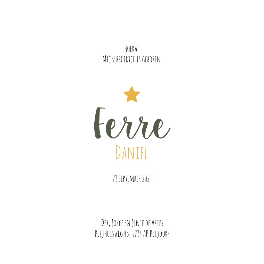 Luxe geboortekaartje voor een zoon met foliedruk. Dit kaartje Ferre heeft een groene achtergrond met een stippen patroon. Op de voorzijde staat een witte cirkel met daarin de babynaam. De goudkleurige elementen op de voorzijde worden gedrukt met écht goudfolie, dat geeft de kaart een exclusieve uitstraling. Liever zilverfolie of roséfolie? Dit is aan te passen in de editor.