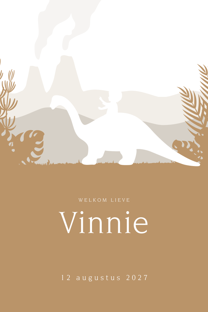 Stoer dino geboortekaartje voor een eerste kindje, jullie zoon! Op dit jongenskaartje Vinnie een vulkanisch ton sur ton landschap met botanische bladeren. In glanzend zwartfolie een dinosaurus met een jongetje op de rug, samen op avontuur. Pas de kleuren, foliedruk, tekst en gezinssamenstelling gemakkelijk aan in de editor. Hulp nodig? We helpen je hier graag bij!