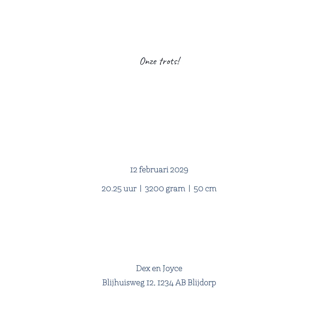 Basic geboortekaartje voor een zoon met foliedruk. Op dit babykaartje Duuk word de naam s op de voorzijde gedrukt met echt goudfolie. Dat geeft je kaartje een extra luxe uitstraling. Een mooie combinatie met de donkerblauwe achtergrond. Ook mogelijk met zilverfolie, roséfolie, holografisch of hoogglans. Dit is aan te passen in de editor.