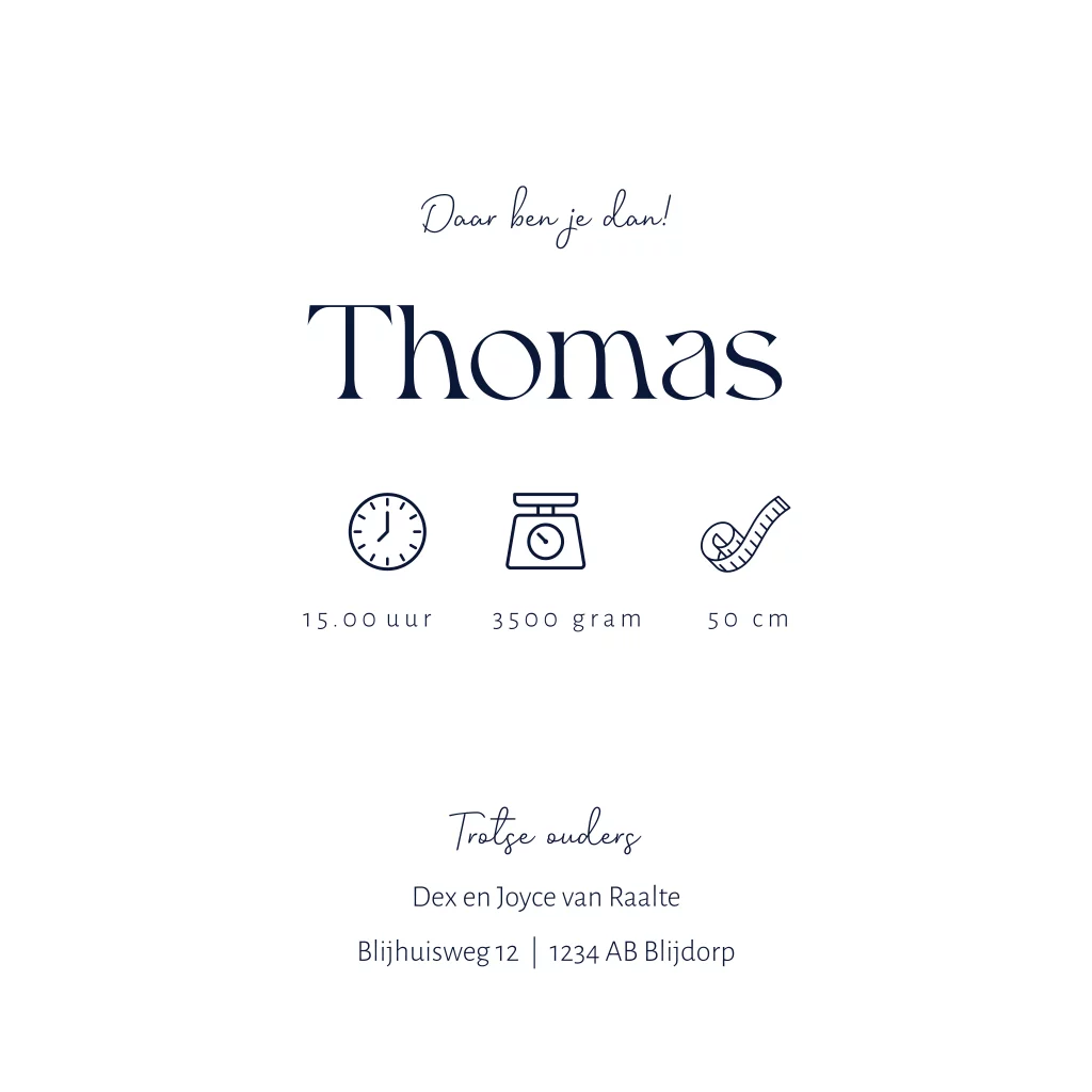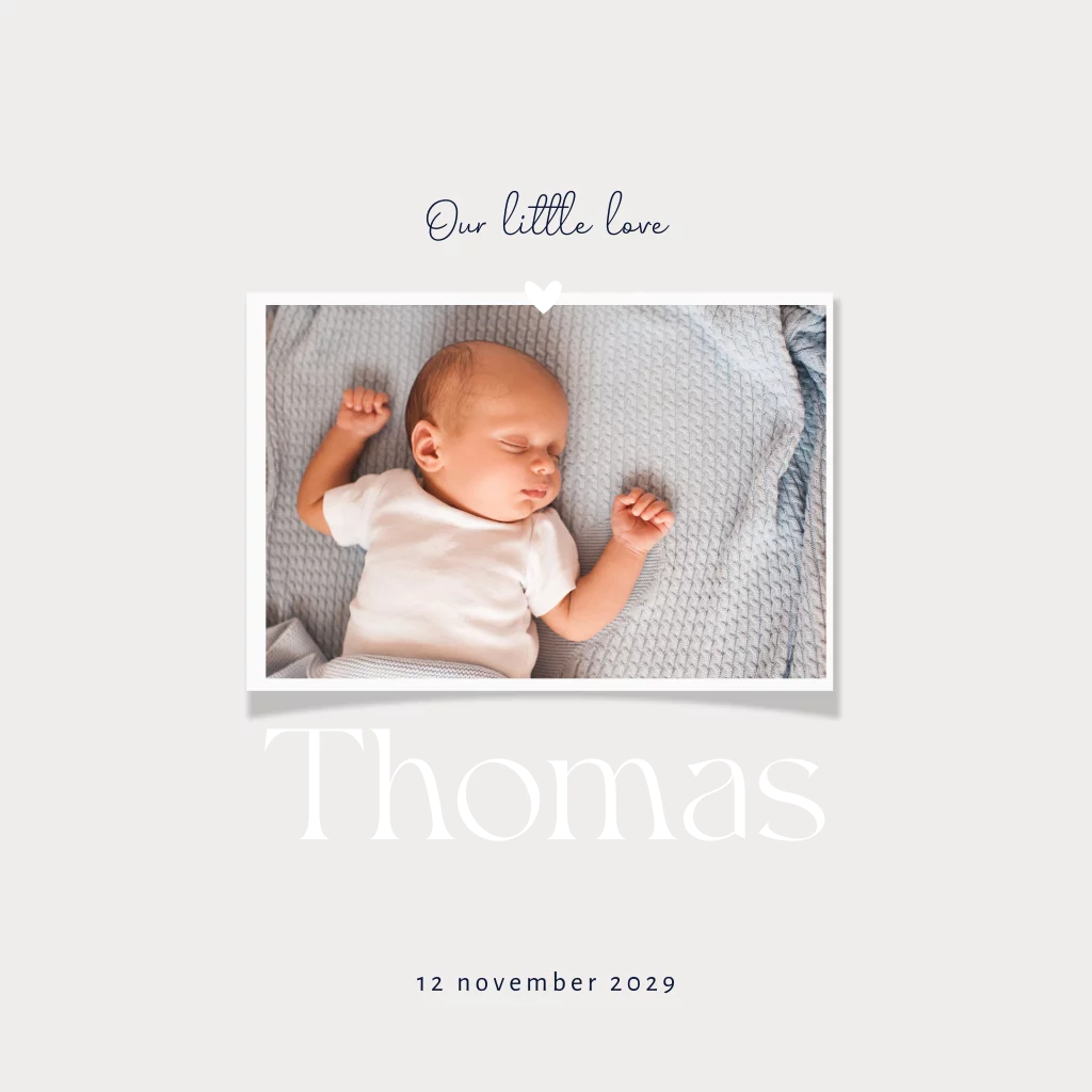 Geboortekaartje voor een jongen of meisje met eigen foto. Op dit kaartje Thomas worden de goudkleurige elementen op de voorzijde gedrukt in echt goudfolie. Dat geeft de kaart een luxe uitstraling. De kleur is gemakkelijk aan te passen naar zilverfolie, roséfolie of holografisch folie. Aan de binnenkant worden de geboortegegevens weergegeven met symbolen.
