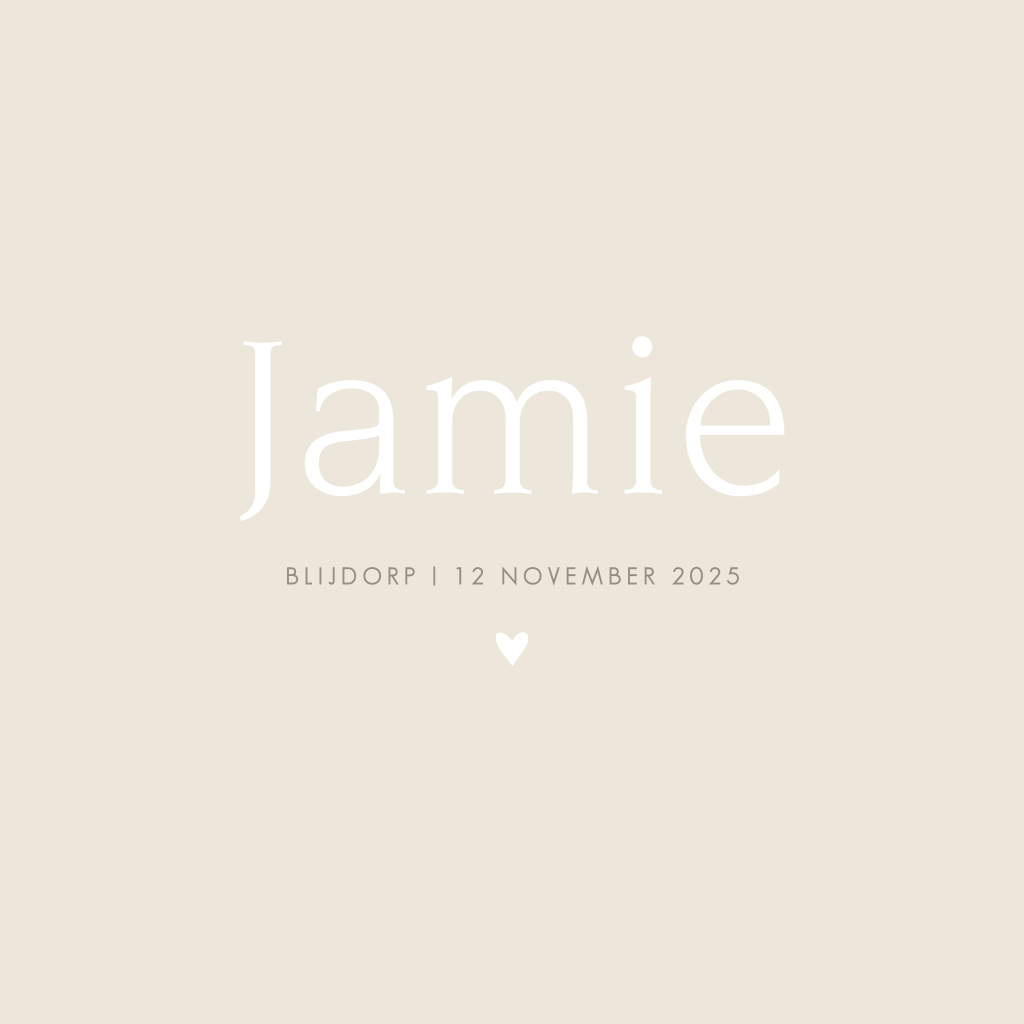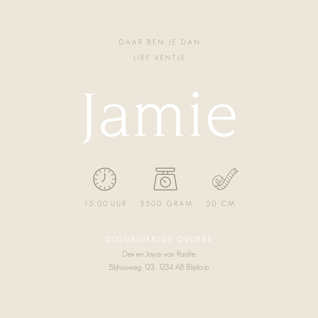 Geboortekaartje voor een jongen met foliedruk. Op dit kaartje Jamie worden de goudkleurige elementen op de voorzijde gedrukt in echt goudfolie. Dat geeft de kaart een extra luxe uitstraling. De kleur is gemakkelijk aan te passen naar koperfolie, zilverfolie, zwartfolie of roséfolie. Aan de binnenkant worden de geboortegegevens weergegeven met symbolen. Gegevens, kleuren en symbolen zijn makkelijk aan te passen in onze editor. Hulp nodig? Wij helpen je graag verder.