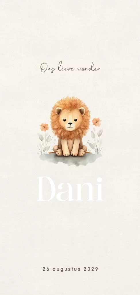 Christelijk geboortekaartje met een geïllustreerde leeuw en foliedruk. Dit kaartje kun je gebruiken voor een jongen of meisje. Op de achterkant staat een bijbeltekst. De babynaam Dani (afgeleid van Daniël) wordt gedrukt met echt goudfolie. Een mooie combinatie met de kleur beige. Wil je liever andere kleuren? Dit pas je gemakkelijk aan in de editor. Door de foliedruk heeft het geboortekaartje een exclusieve uitstraling. Ook mooi met zilverfolie of roséfolie.