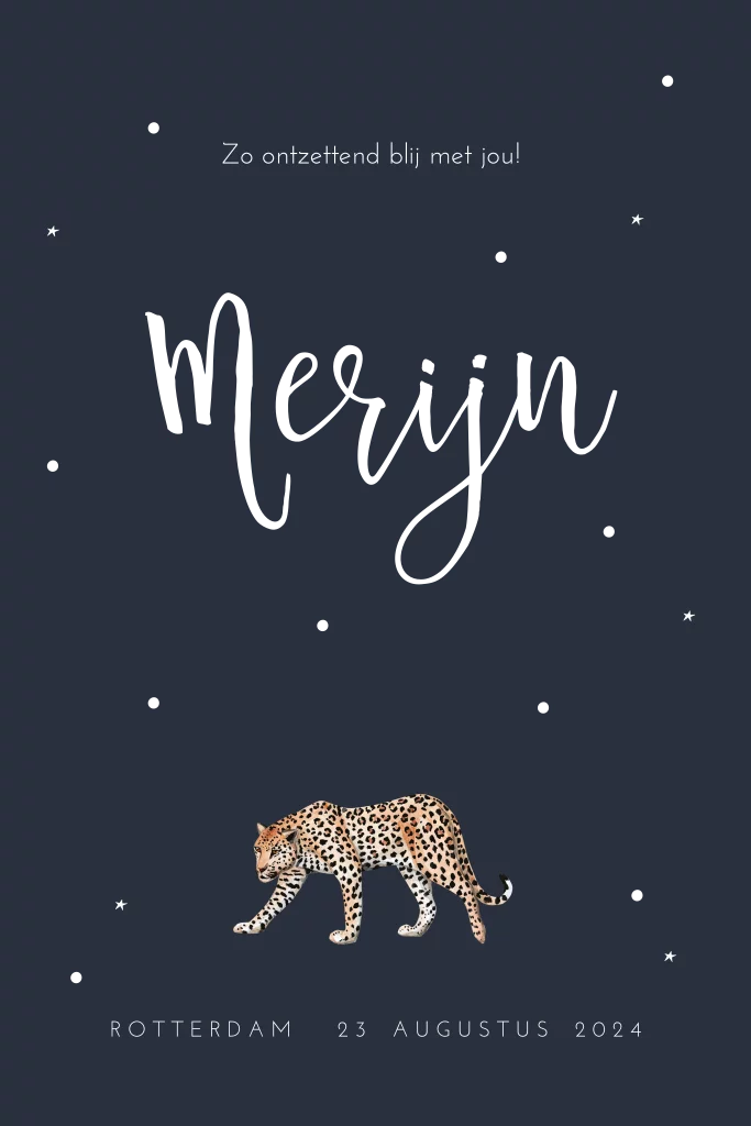 Trendy geboortekaartje voor een jongen. De blauwe achtergrond is een erg mooie combinatie met de gouden koper. De naam en stippen op de voorzijde van dit kaartje Merijn worden gedrukt in echt goudfolie. Dit geeft deze kaart een exclusieve uitstraling. Liever zilverfolie of roséfolie? Dit is gemakkelijk aan te passen in de editor.