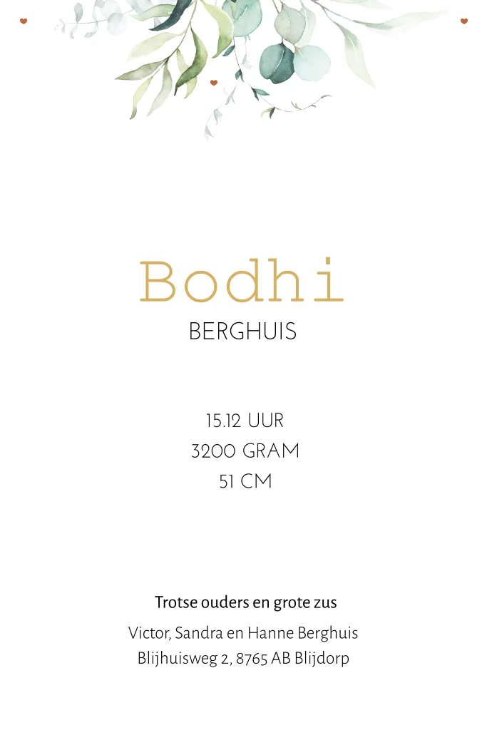 Trendy geboortekaartje dat zowel voor een jongen als een meisje geschikt is. Oftewel een unisex kaartje. De koperen elementen op de voorzijde van dit botanische kaartje worden gedrukt in goudfolie, dat geeft de kaart een luxe uitstraling. De kleur van de folie is gemakkelijk aan te passen naar zilverfolie of roséfolie.