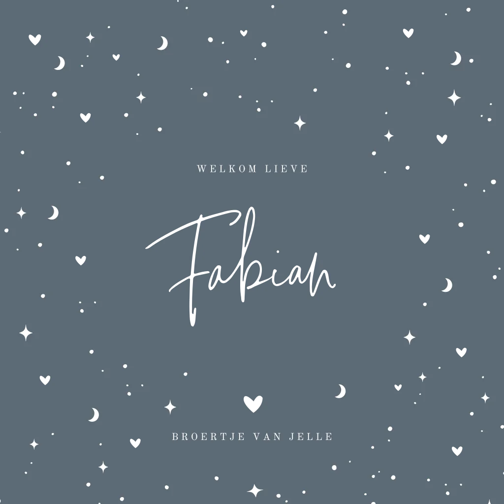 Hip geboortekaartje voor een zoon met ronde hoeken en foliedruk. Op dit kaartje Fabian worden de babynaam en de kleine hartjes op de voorzijde gedrukt in echt goudfolie. De folie heeft een mooie glans en geeft je kaartje een extra luxe uitstraling. De teksten en kleuren zijn aan te passen in de editor.