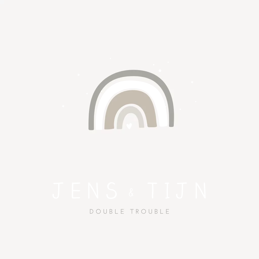 Lief geboortekaartje voor 2 jongens met foliedruk en trendy regenboog. Op dit tweeling kaartje Jens en Tijn worden de babynamen en de goudkleurige hartjes en sterretjes op de voorzijde gedrukt in écht goudfolie. Dit komt mooi naar voren op de lichte achtergrond en geeft het kaartje een extra luxe uitstraling. Pas dit kaartje naar je eigen smaak aan in de editor en combineer met een mooie bijpassende envelop om het helemaal af te maken. Ook mogelijk met zilverfolie of roséfolie.