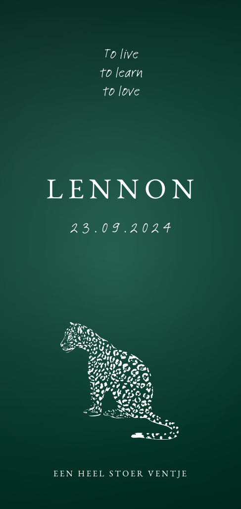 Basic geboortekaartje voor een jongen met zilverfolie. De naam en de panter op de voorzijde van dit babykaartje Lennon worden gedrukt in echt zilverfolie. Liever goudfolie, koperfolie of roséfolie? Pas dit eenvoudig aan in de editor.