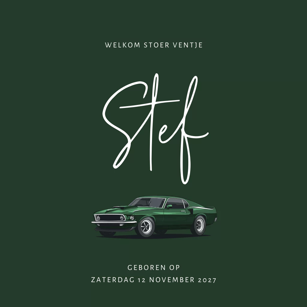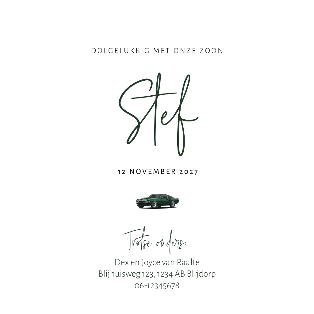 Retro stoer geboortekaartje met auto voor een zoon. Op dit kaartje staat de baby naam Stef geschreven in sierlijke letters. De naam wordt gedrukt in echt zilverfolie.