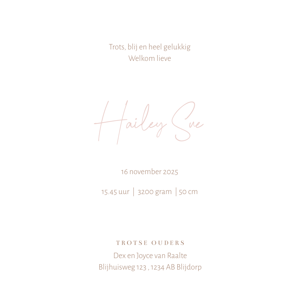 Folie geboortekaartje voor een dochter met stijlvolle bloemen. Enkele bloemen en de babynaam worden gedrukt in echt roséfolie. De folie heeft een mooie glans en geeft dit kaartje een extra luxe uitstraling. Voor de naam is een sierlijk lettertype gebruikt. Pas dit kaartje naar je eigen smaak aan in de editor.