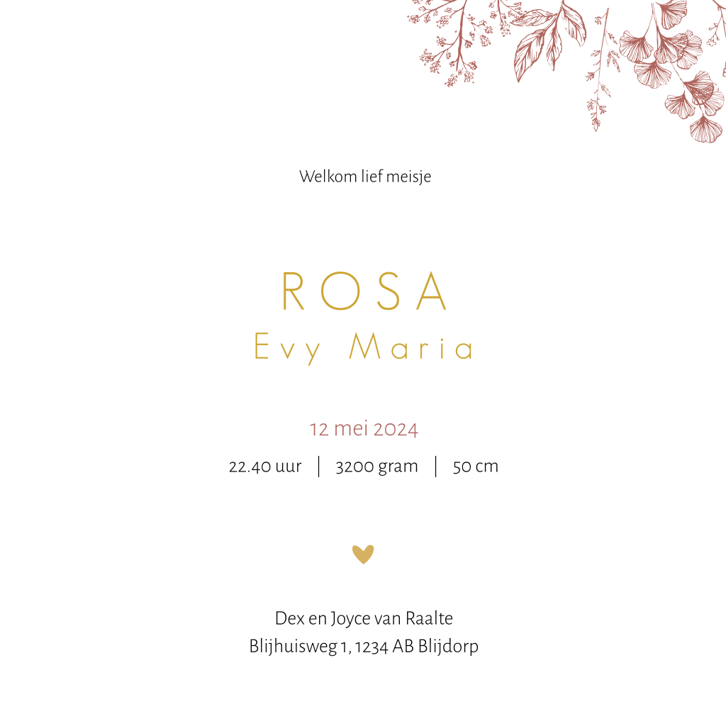Geboortekaartje voor een meisje in botanische stijl. De gouden elementen op de voorzijde van de kaart, waaronder de naam van de baby, het kader en de stippen, worden gedrukt in echt goudfolie. Dat geeft de kaart een luxe uitstraling! Liever zilverfolie, koperfolie of roséfolie? Geen probleem, dit is gemakkelijk aan te passen in de editor.