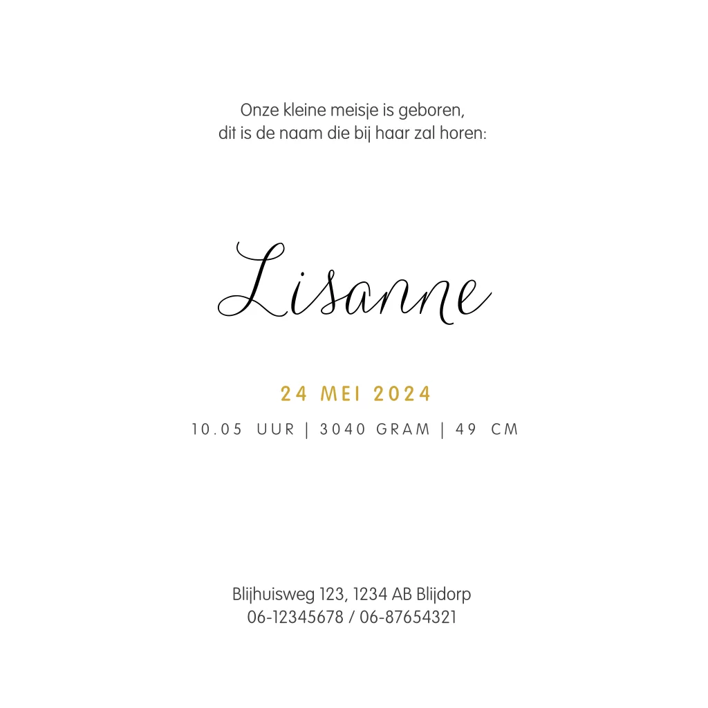 Lief geboortekaartje voor een meisje. Op dit kaartje staat een hartjes regen die gedrukt wordt in echt goudfolie. Dit geeft de kaart een extra luxe uitstraling. Liever zilverfolie, koperfolie of roséfolie? Dit is gemakkelijk aan te passen in de editor.