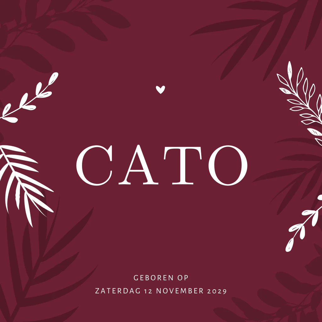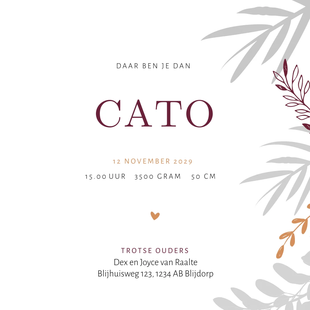 Hip geboortekaartje voor een meisje met foliedruk. Dit kaartje Cato heeft een trendy bordeaux rode achtergrondkleur en verschillende botanische takjes en bladeren. De goudkleurige elementen op de voorzijde gedrukt in echt goudfolie. Dat geeft de kaart een luxe uitstraling. De kleur is gemakkelijk aan te passen naar zilverfolie of roséfolie.