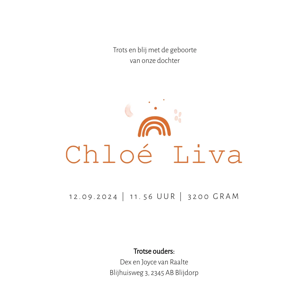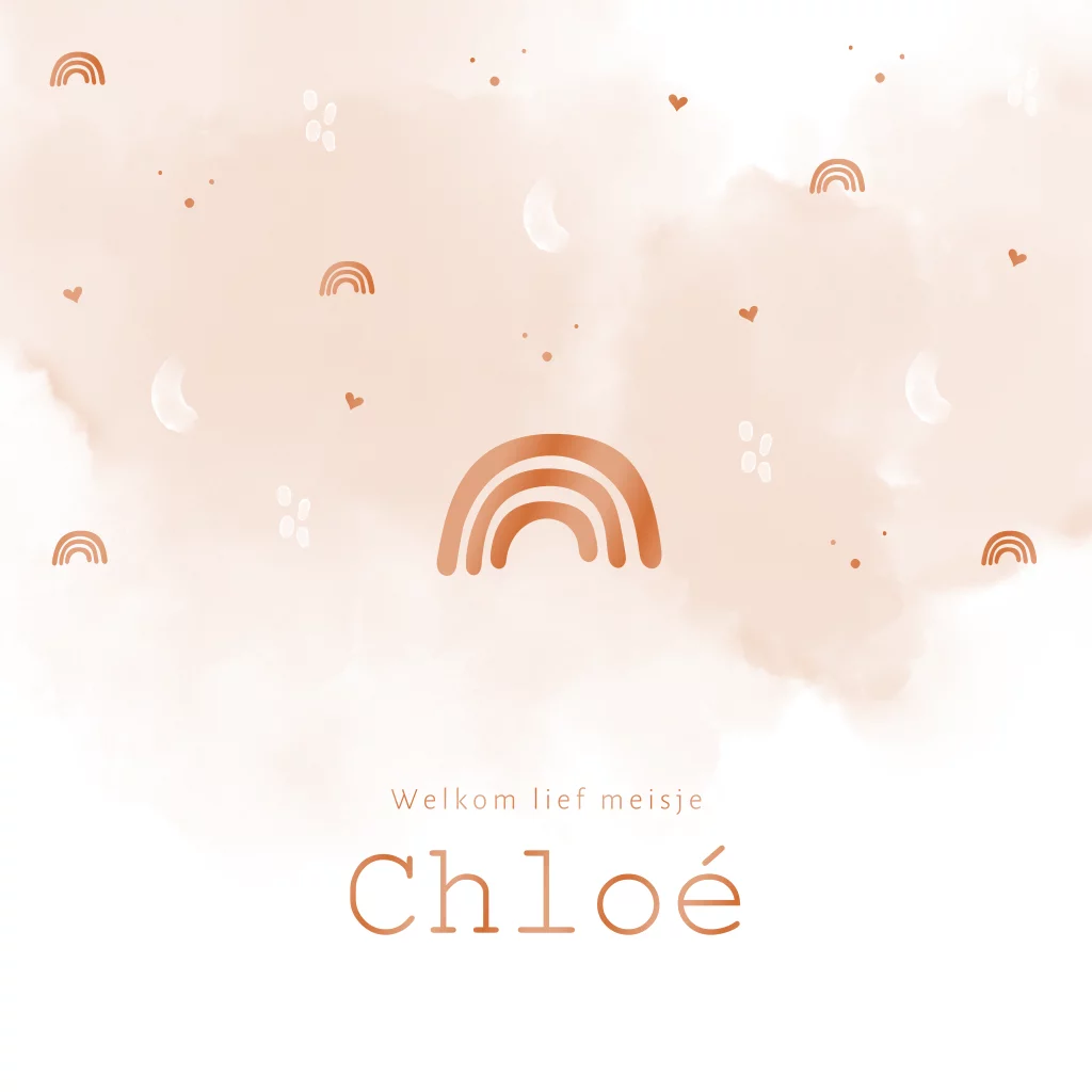 hoogglans en regenboogjes. De koperkleurige elementen op de voor- en achterzijde van dit kaartje, waaronder de regenboogjes, de babynaam Chloé en de kleine hartjes, worden gedrukt in hoogglans. Een mooie combinatie met de roze aquarel op de achtergrond. Ook mogelijk met goudfolie, zilverfolie of roséfolie. Pas de kaart naar je eigen smaak aan in de editor en combineer met een mooie bijpassende envelop.
