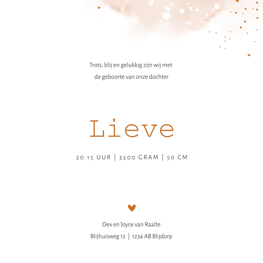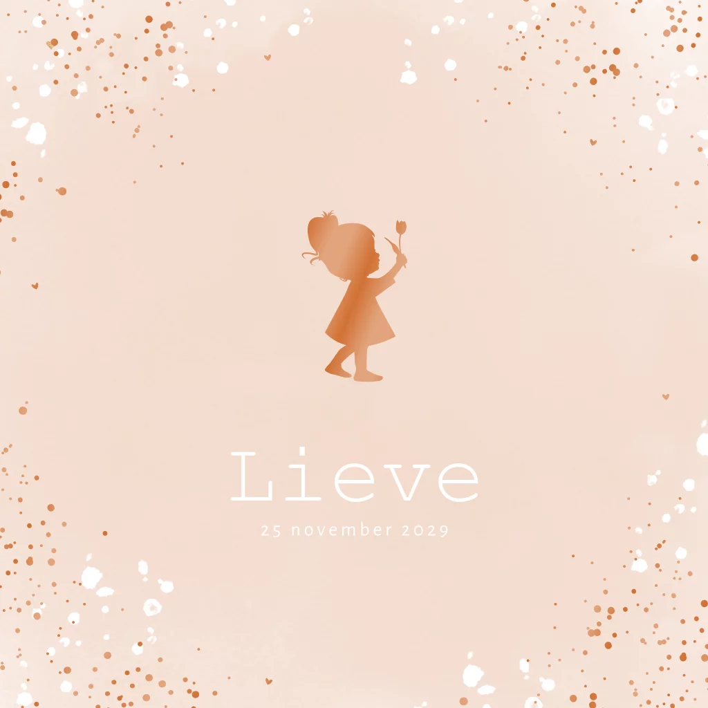 Exclusief geboortekaartje voor een dochter met silhouet en hoogglans. Op dit kaartje Lieve zie je een meisje met een bloempje in haar hand. Het silhouet en de koperkleurige spetters en hartjes worden gedrukt in hoogglans. Een erg mooie combinatie met wit en de roze aquarel achtergrond. Liever goudfolie, zilverfolie of roséfolie? Dit is aan te passen in de editor. Ook mogelijk met een ander silhouet.