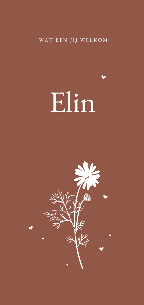 Geboortekaartje voor een meisje met foliedruk. Alle elementen op de voorzijde van dit kaartje Elin worden gedrukt in echt roséfolie, dus o.a. de naam van jullie dochter, het mooie sierlijke bloempje en de kleine hartjes. Op de achtergrond is de trendy kleur roestbruin gebruikt. De teksten en kleuren zijn aan te passen in de editor. Ook mogelijk met goudfolie, koperfolie of zilverfolie.