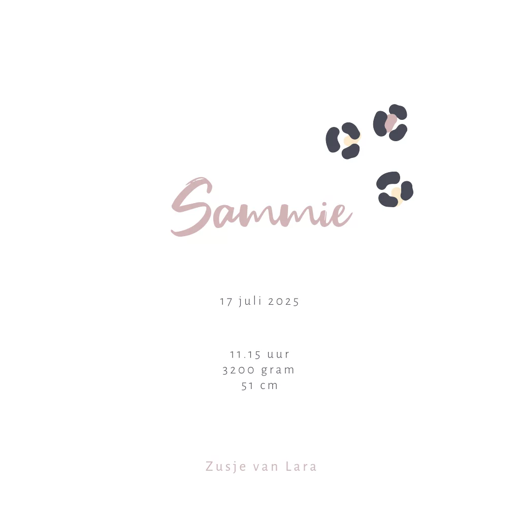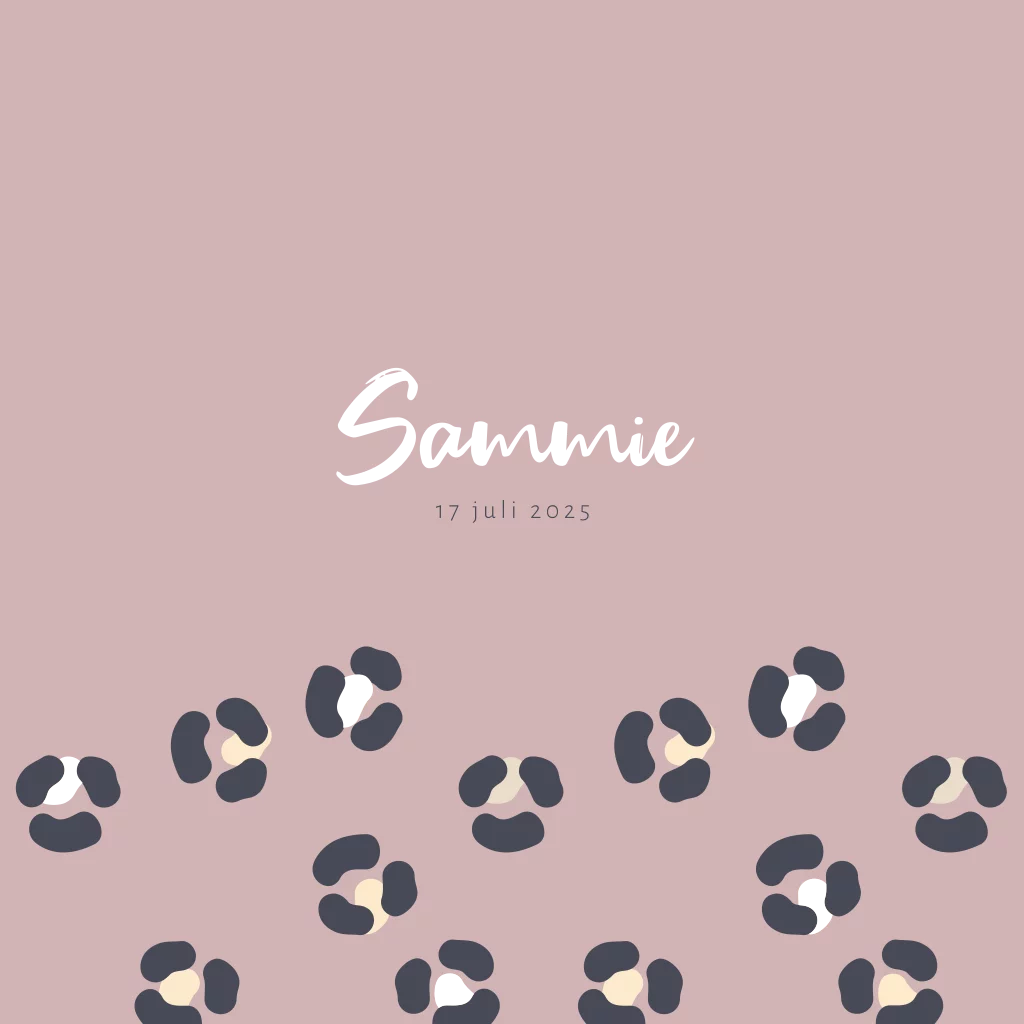 Geboortekaartje voor een dochter waarbij panterprint is gecombineerd met roséfolie. De roséfolie komt mooi naar voren op de oud roze achtergrond. Doordat de folie een mooie glans heeft, krijgt dit meisjeskaartje Sammie een extra luxe uitstraling. De teksten en kleuren kun je naar wens aanpassen in de editor.