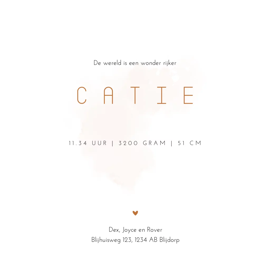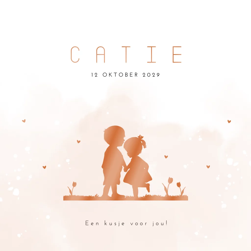 Silhouet geboortekaartje voor een tweede kindje, een dochter. Op dit meisjeskaartje Catie staat een grote broer die zijn kleine zusje een kusje geeft. De koperkleurige elementen, waaronder de babynaam, het silhouet en de hartjes, worden gedrukt in hoogglans. Hoogglans geeft je kaartje een extra luxe uitstraling. De roze aquarel op de achtergrond geeft een mooi effect. Ook mogelijk met een ander silhouet of voor een andere gezinssamenstelling. De lettertypes en kleuren zijn naar je eigen smaak aan te passen.