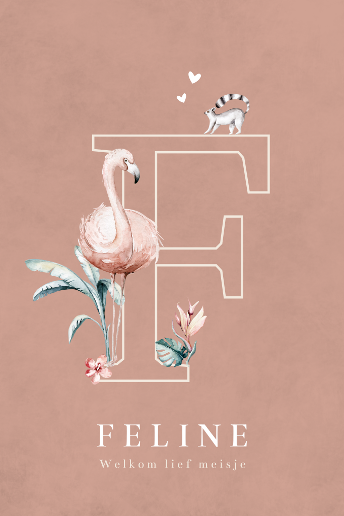 Meisjes geboortekaartje met voorletter en flamingo. De voornaam en de kleine hartjes op de voorzijde worden gedrukt in écht roséfolie, de folie heeft een mooie glans en geeft je kaartje een extra luxe uitstraling.