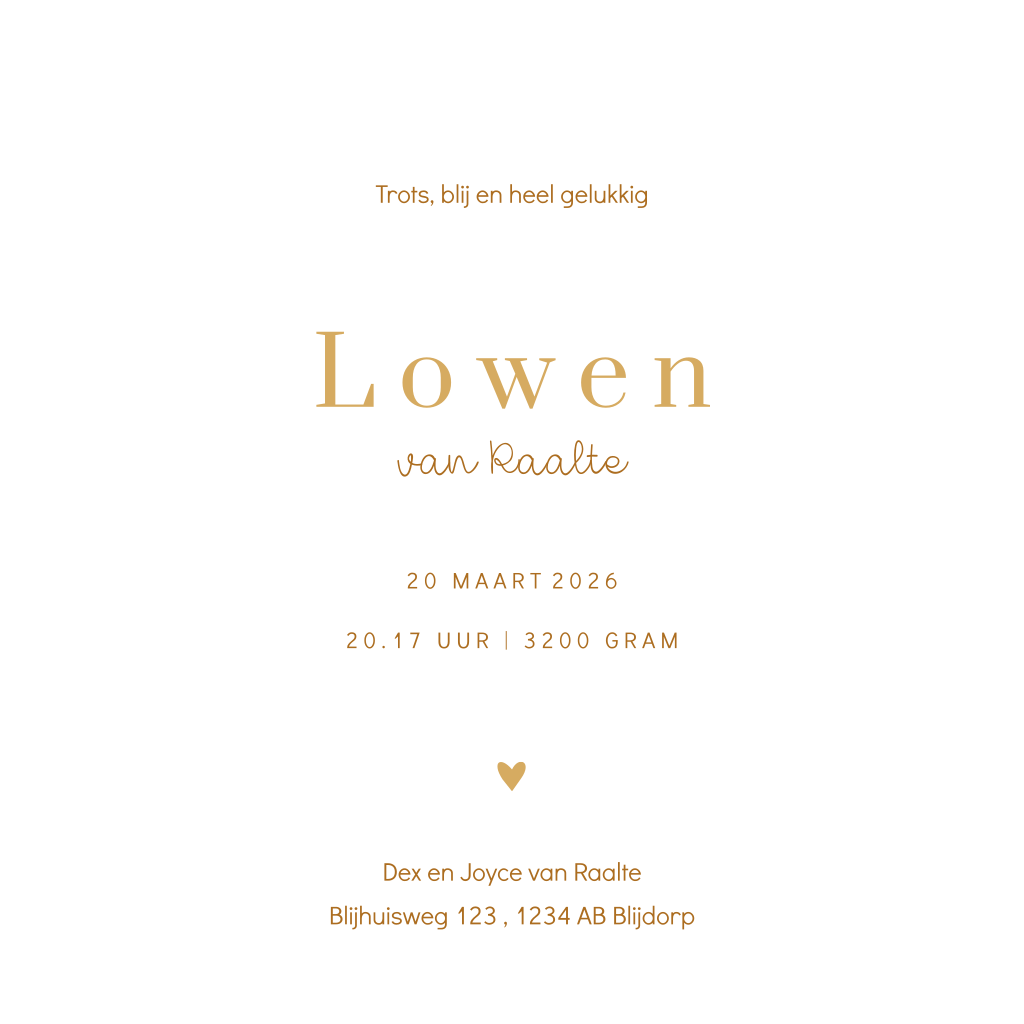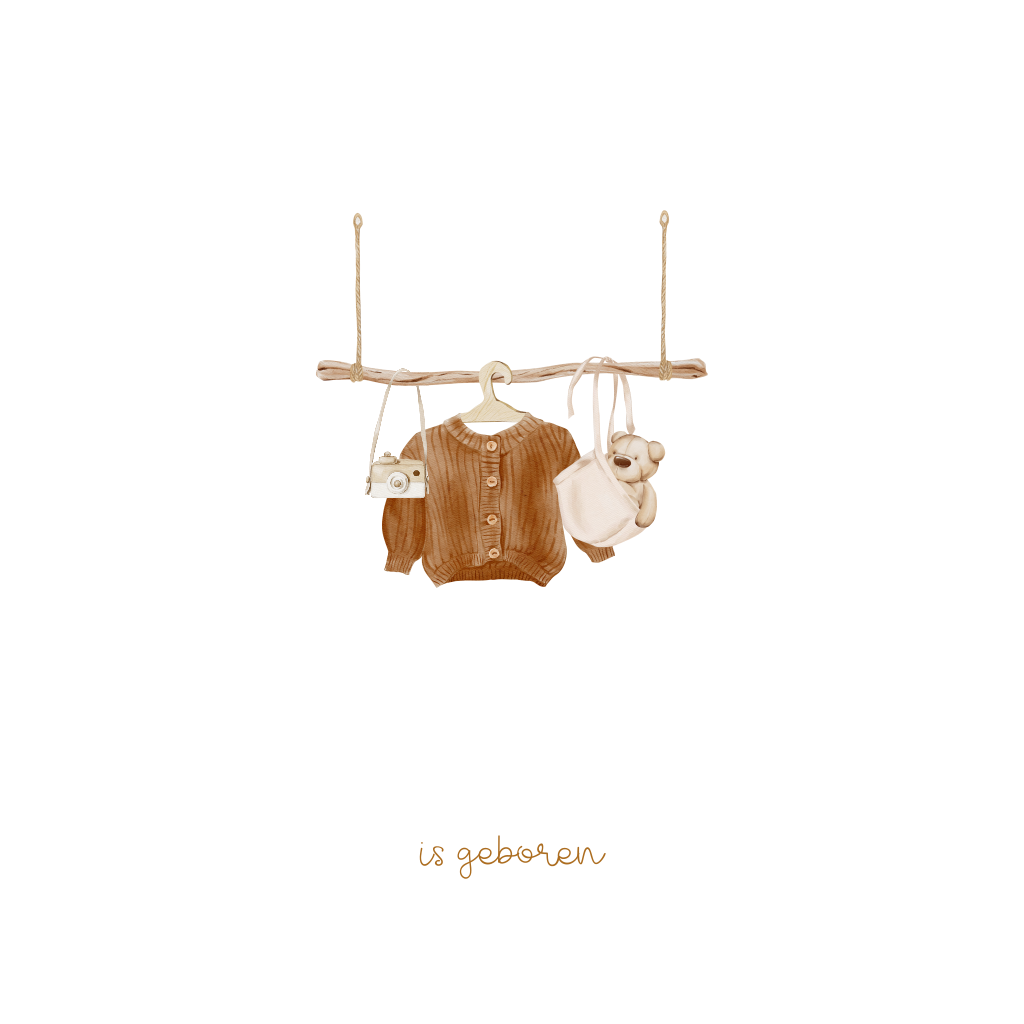Rustig genderneutraal geboortekaartje voor zowel een jongen als meisje. Op dit rustige babykaartje Lowen een houten kapstokje met daaraan een gebreid bruin vestje, fotocamera en een teddybeer. De naam van jullie kindje wordt gedrukt in écht goudfolie. Dat geeft deze kaart een extra luxe uitstraling. Wil je liever koperfolie, zilverfolie, zwartfolie of roséfolie? Pas het makkelijk aan in onze editor.