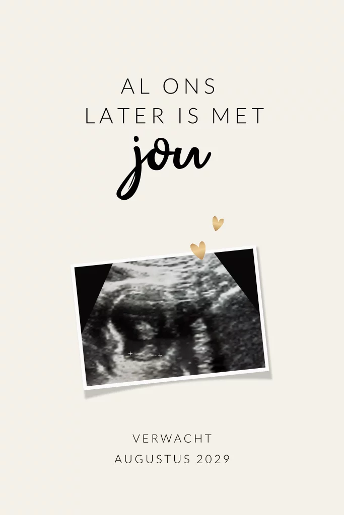 deze hippe en originele kaart met de tekst "Al ons later is met jou" en enkele kleine hartjes. Voeg jouw eigen echo foto toe. Plaats een persoonlijke tekst op de achterkant en verras familie en vrienden met dit fantastische nieuws!