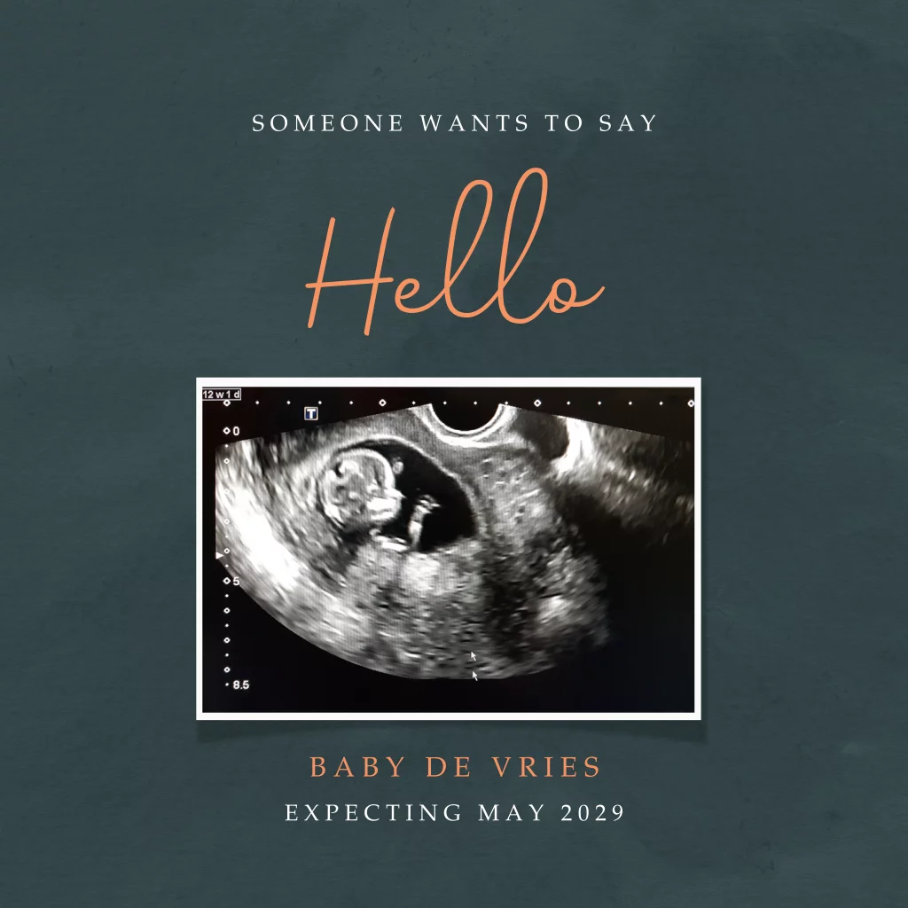Someone wants to say helllo! Originele aankondiging voor een baby op komst. Gebruik voor deze kaart een eigen foto. Dit kaartje heeft een ruwe achtergrond en trendy kleuren. Pas de kaart naar wens aan in de editor.