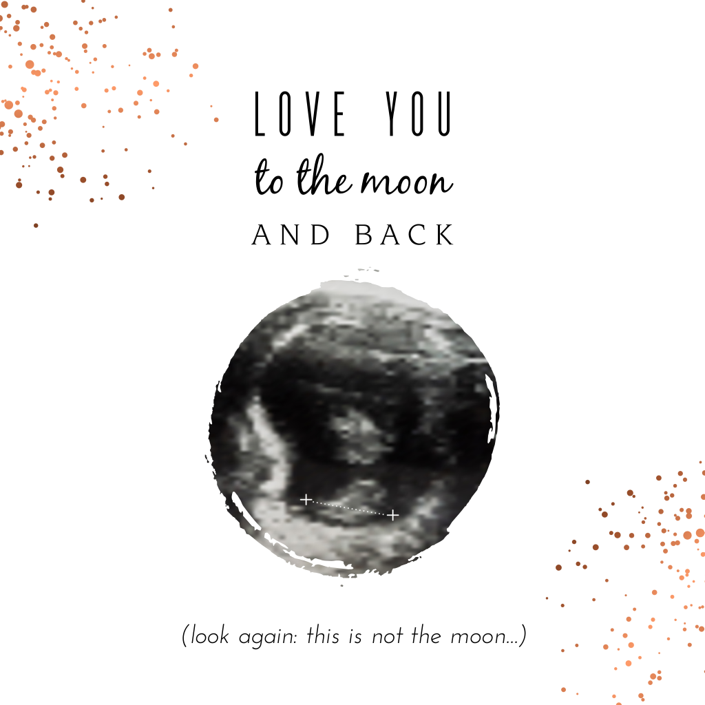 Love you to the moon and back! Hippe en originele aankondiging voor een baby op komst. Gebruik voor deze kaart een eigen echo foto en verras familie en vrienden met jullie blije nieuws. Lukt het niet om de foto goed achter het frame te krijgen? We helpen je graag!