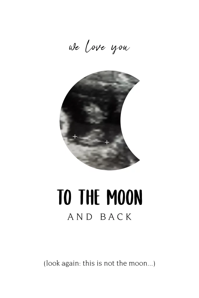 Love you to the moon and back! Hippe en originele aankondiging voor een baby op komst. Gebruik voor deze kaart een eigen echo foto en verras familie en vrienden met jullie blije nieuws. Over de foto zit een fotoframe in de vorm van een maan. Lukt het niet om de foto goed achter het frame te krijgen? We helpen je graag!