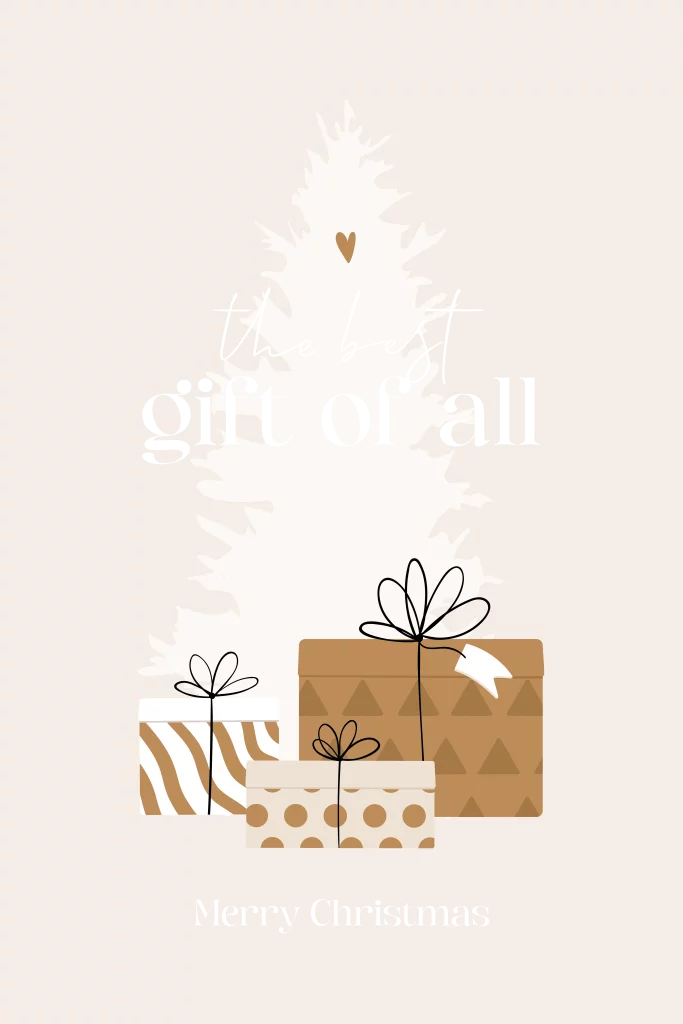 Ben je in blijde verwachting en mag je dit rond de Kerst aan iedereen verkondigen? Stuur of geef deze hippe kerstkaart en kondig hiermee je zwangerschap aan. Op deze beige kaart een kerstboom met cadeautjes en de tekst 'The best gift of all' in goudfolie. Op de binnenzijde kun je een foto van de echo toevoegen. De teksten, kleuren en lettertypes van het kaartje zijn aan te passen in de editor.