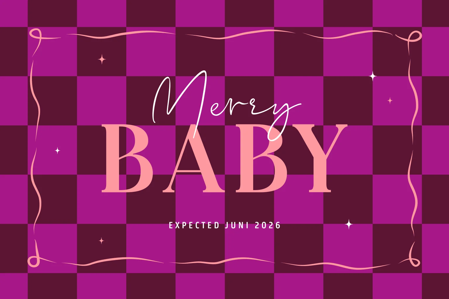 Vier de komst van jullie kleintje met deze feestelijke zwangerschapsaankondiging met kerstthema. Op deze kaart staat de tekst ´Merry baby´ in een speels kader. De achtergrond bevat een opvallend blokjespatroon in roze en paarse kleurtinten. De ronde hoeken van deze kaart zorgen voor een speels effect. Pas deze kaart naar eigen wens aan in onze online editor en maak het kaartje af met de lavendel envelopkleur.