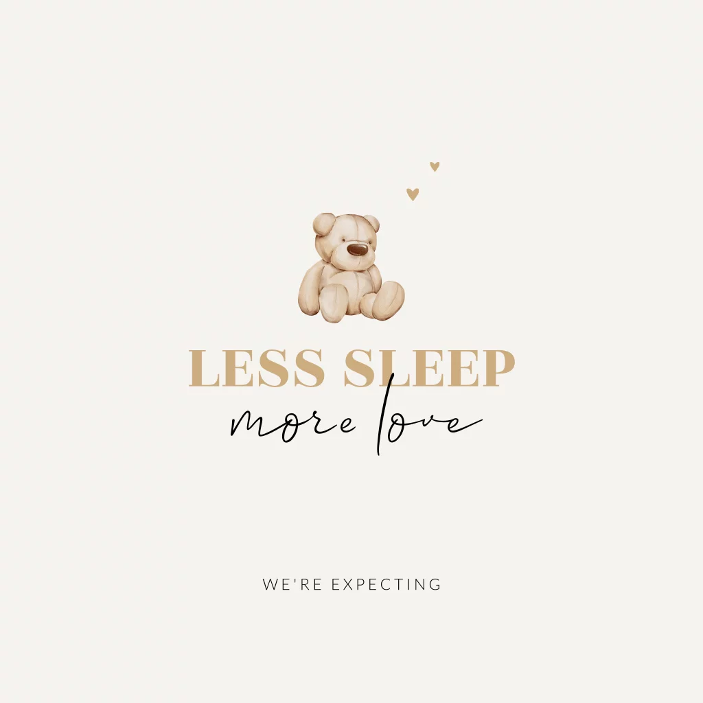 Verwachten jullie binnenkort een kleintje? Kondig jullie fantastische nieuws aan bij vrienden en familie met deze originele zwangerschapsaankondiging. Deze kaart is overwegend beige met een teddybeer en de tekst "Less sleep, more love." Teksten, kleuren en lettertypes zijn aan te passen in de editor.