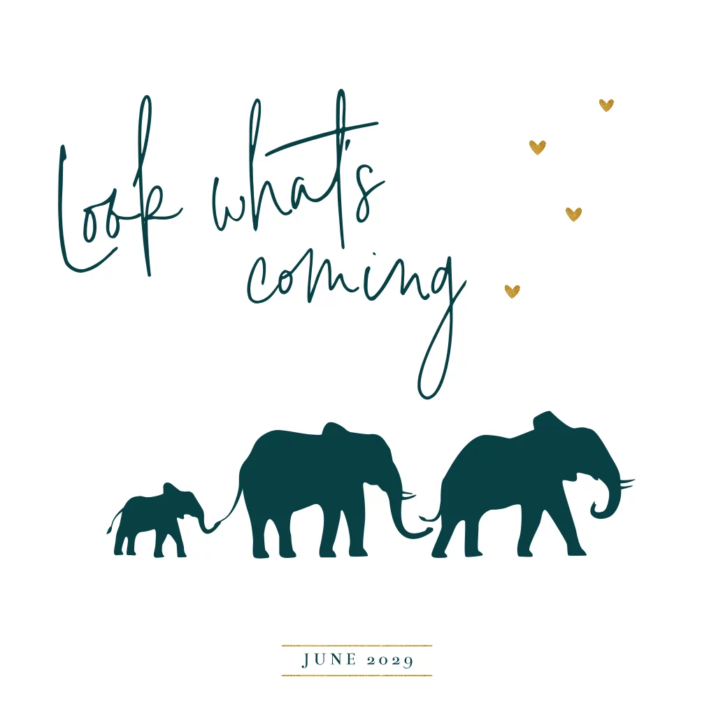 Look what's coming! Een vrolijke aankondiging voor je zwangerschap met een olifantjes gezin. Maak van deze kaart je eigen persoonlijke zwangerschapsaankondiging. Teksten en kleuren zijn aan te passen in de editor.