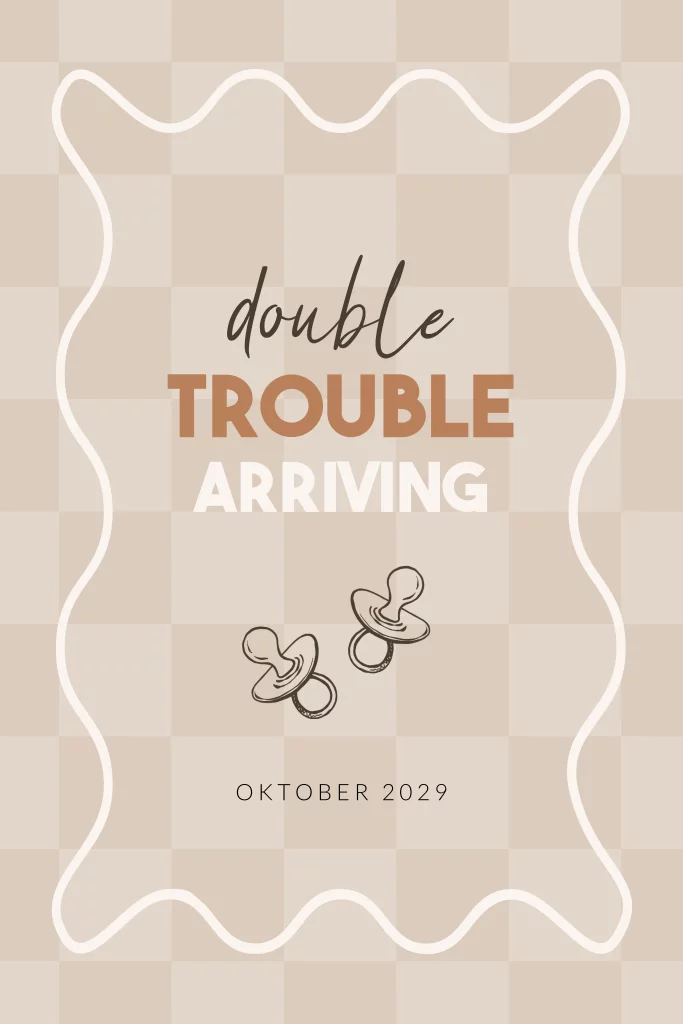 Is er een tweeling op komst? Maak dit op een bijzondere manier bekend aan je familie en vrienden door middel van deze leuke en hippe zwangerschapsaankondiging. Op deze kaart staat de tekst "double trouble arriving" met 2 speentjes. Pas de maand aan naar de uitgerekende datum en voeg een persoonlijke tekst toe op de achterkant.