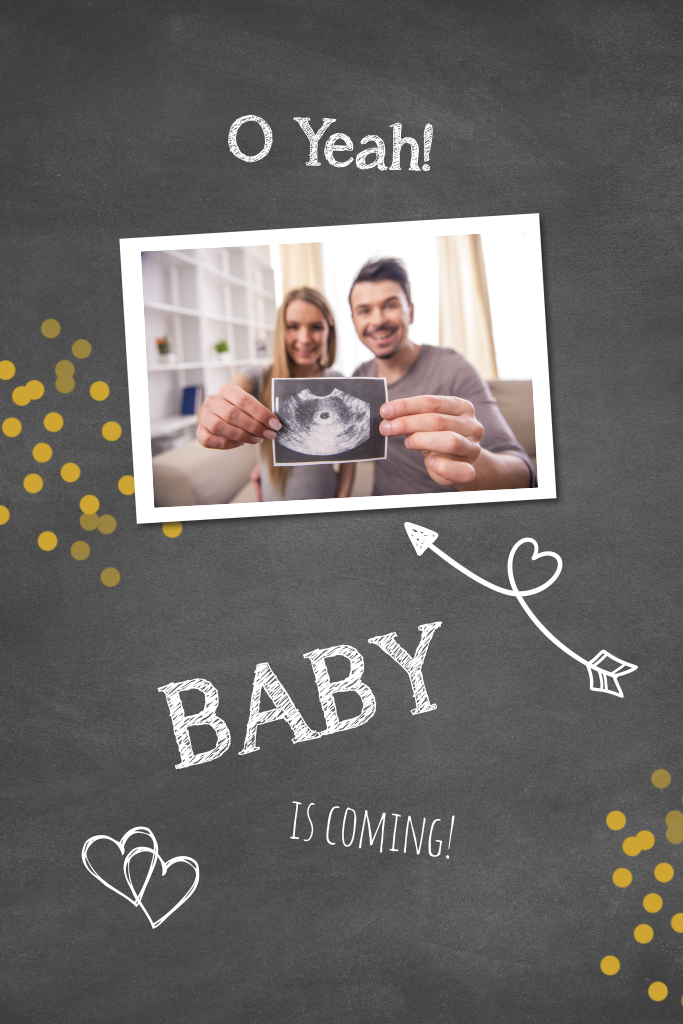 Met deze leuke kaart kun je aan je omgeving laten weten dat je zwanger bent! Deze zwangerschapsaankondiging met krijtbord achtergrond is gedecoreerd met goudkleurige confetti, hartjes en een pijl. Plaats je eigen foto om de kaart helemaal af te maken!