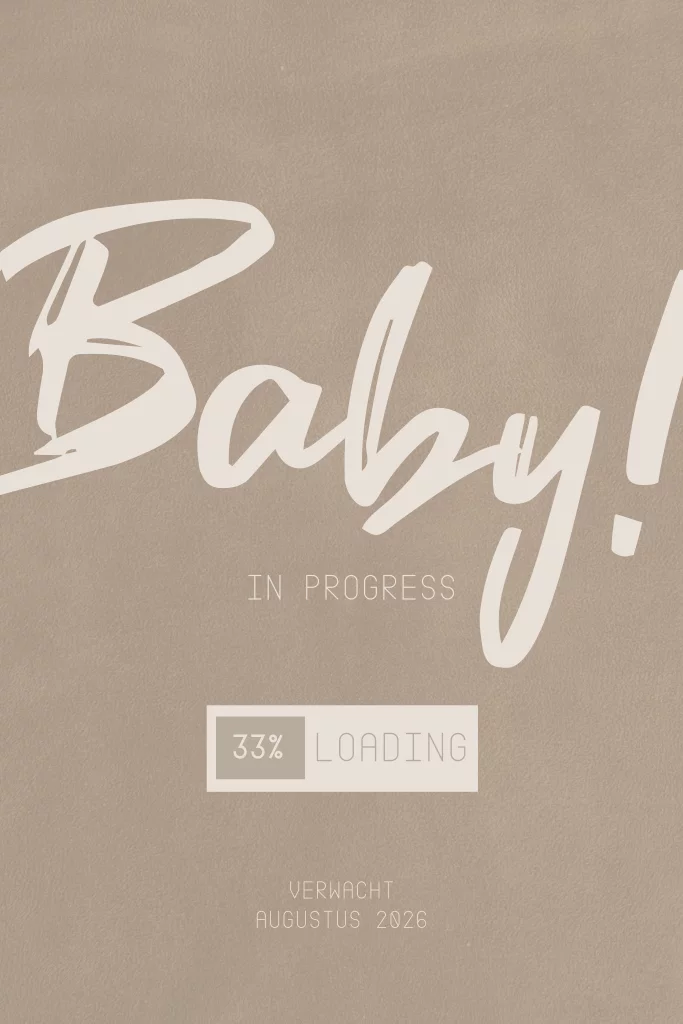 Baby in progress! Kaartje met de aankondiging van jullie zwangerschap. Een kaart in trendy natuurlijke kleuren, een zachte velvet look achtergrond en een voortgangsbalk met percentage. Gebruik deze leuke kaart en maak hiervan zelf je eigen persoonlijke zwangerschapsaankondiging.