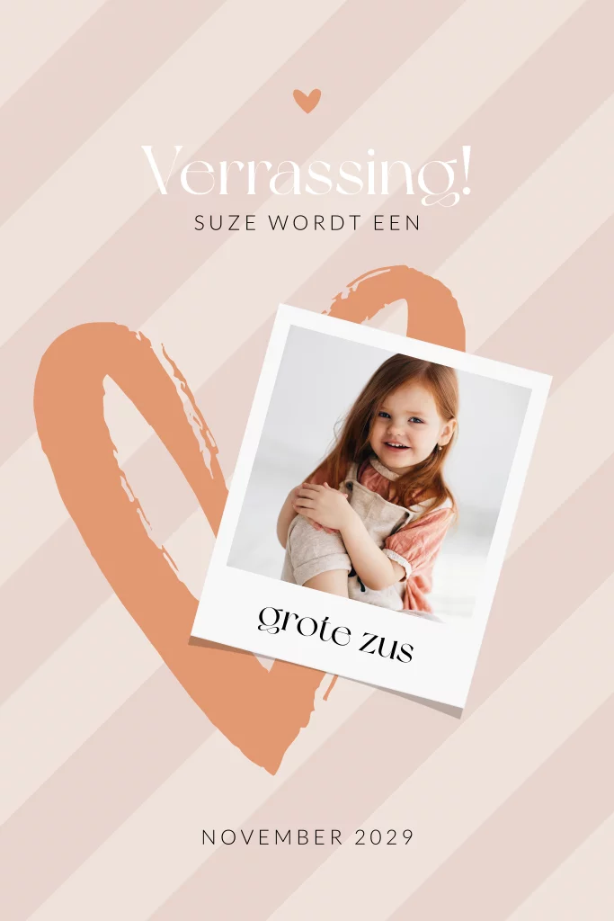 Leuke kaart waarin de grote zus de zwangerschap aankondigt. Achter de foto staat een aquarel hart. Gebruik een persoonlijke foto en maak zo je eigen unieke zwangerschapsaankondiging.