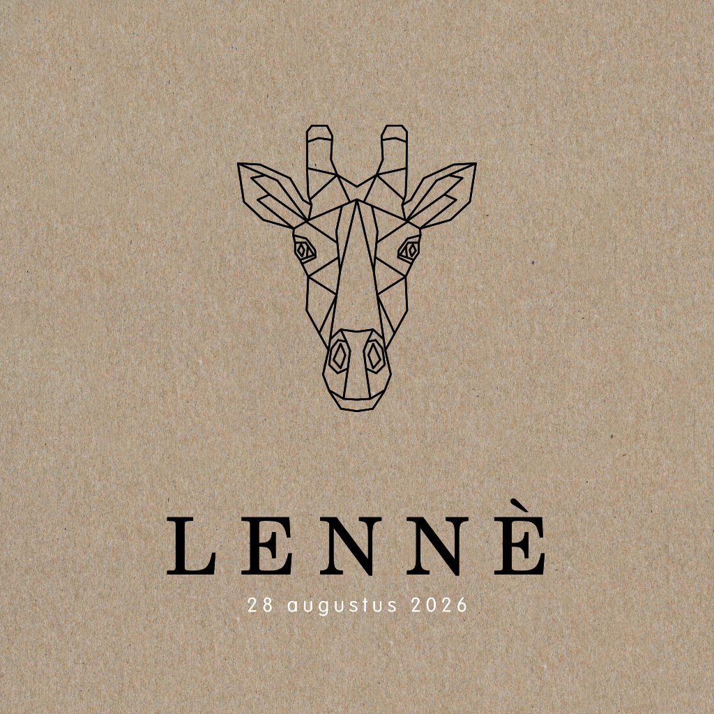 Hip jongens geboortekaartje op écht kraft papier met de kop van een giraf in geometrische lijnen. Het dieren kaartje Lennè heeft een rustige uitstraling, maar door het échte kraft papier, met een mooie dikke structuur, krijgt het kaartje een stoere uitstraling. De afgeronde hoeken maken het babykaartje nog net iets exclusiever.