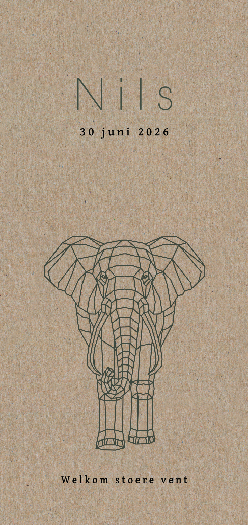 Basic jongens geboortekaartje gedrukt op écht kraft. Op kraft papier komen minimalistische designs in zwart en wit het mooist uit. Op dit rondhoek kaartje Nils staat een geometrische olifant, speciaal voor jullie stoere vent! Pas de teksten en lettertypes naar wens aan in de editor.
