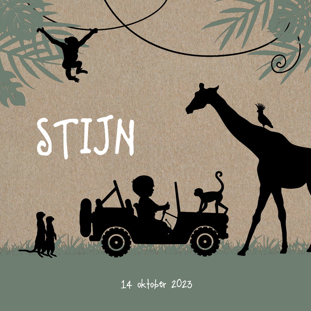 Jungle silhouet geboortekaartje voor een zoon. Op dit kaartje Stijn zie je een jongen rijdend in een safari jeep met verschillende dieren, zoals een giraffe, aap en kaketoe. Wat dit kaartje extra bijzonder maakt, is dat deze wordt gedrukt op écht kraft papier. Kraft papier heeft een stoere structuur en geeft het kaartje een hippe uitstraling.