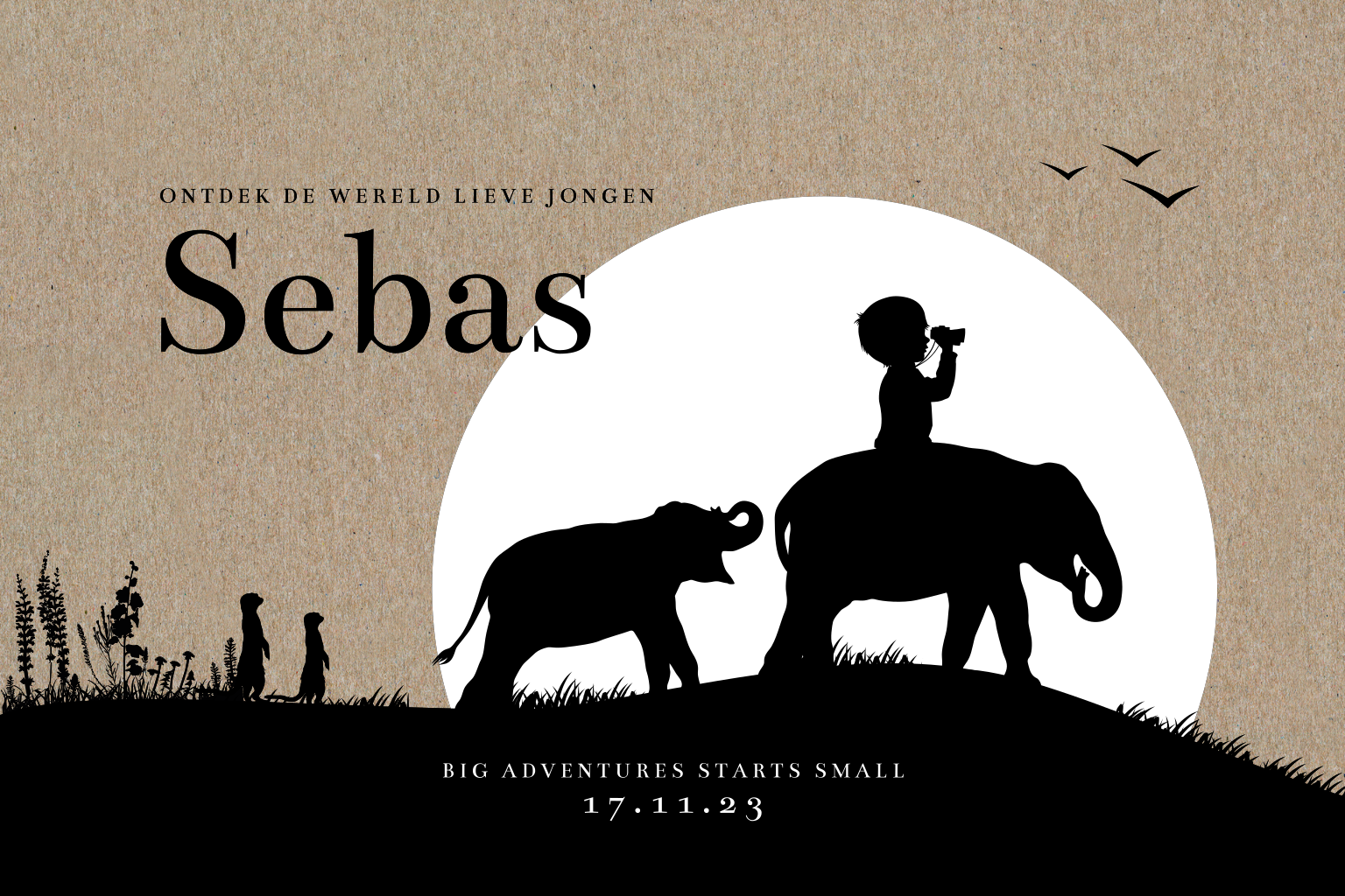 Avontuurlijk silhouet geboortekaartje voor een jongen in safari thema. Op dit hippe kaartje Sebas staat een jongetje rijdend op een olifant met in zijn hand een verrekijker. Wat dit kaartje extra bijzonder maakt, is dat het gedrukt wordt op écht kraftpapier. Deze papiersoort heeft een stoere structuur en hippe uitstraling. De teksten en lettertypes, evenals de silhouetten zijn aan te passen.