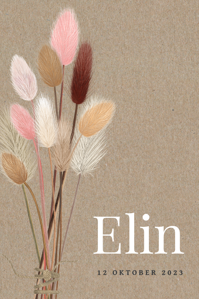 Geboortekaartje voor een meisje met hippe droogbloemen. Dit kaartje Elin wordt gedrukt op écht kraft papier. Kraft papier is een mooie dikke papiersoort met een stoere structuur. De combinatie met de droogbloemen is helemaal hip!