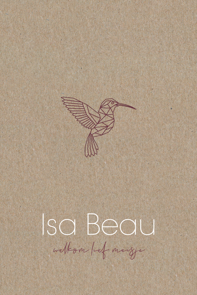 Geboortekaartje voor een heel lief meisje. Op dit kaartje Isa Beau een geometrische vogel, want jullie dochter fladdert de wijde wereld in! Dit kaartje met afgeronde hoeken wordt gedrukt op écht kraft papier. Kraft papier is een mooie dikke papiersoort met een stoere structuur. Ook mogelijk met een andere geometrische afbeelding. Teksten en lettertypes pas je eenvoudig aan in onze editor.