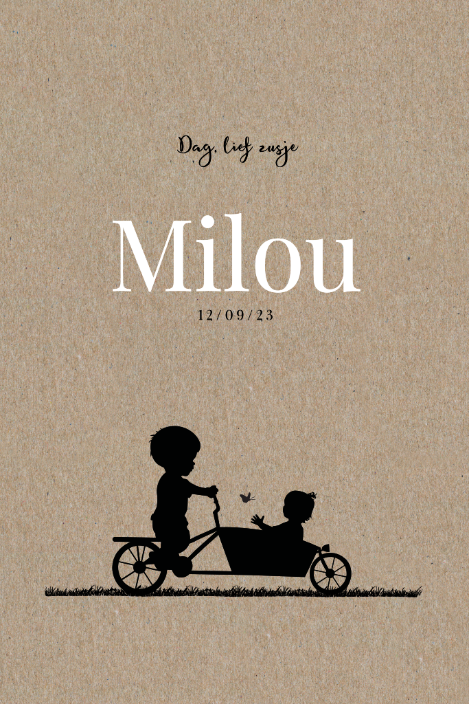 Geboortekaartje voor een tweede kindje, een meisje. Op dit kaartje Milou staat een grote broer op de bakfiets met voorin zijn kleine baby zusje. Dit kaartje wordt gedrukt op écht kraft papier. Kraft papier is een mooie dikke papiersoort met een stoere structuur. Ook mogelijk met een ander silhouet of voor een andere gezinssamenstelling.