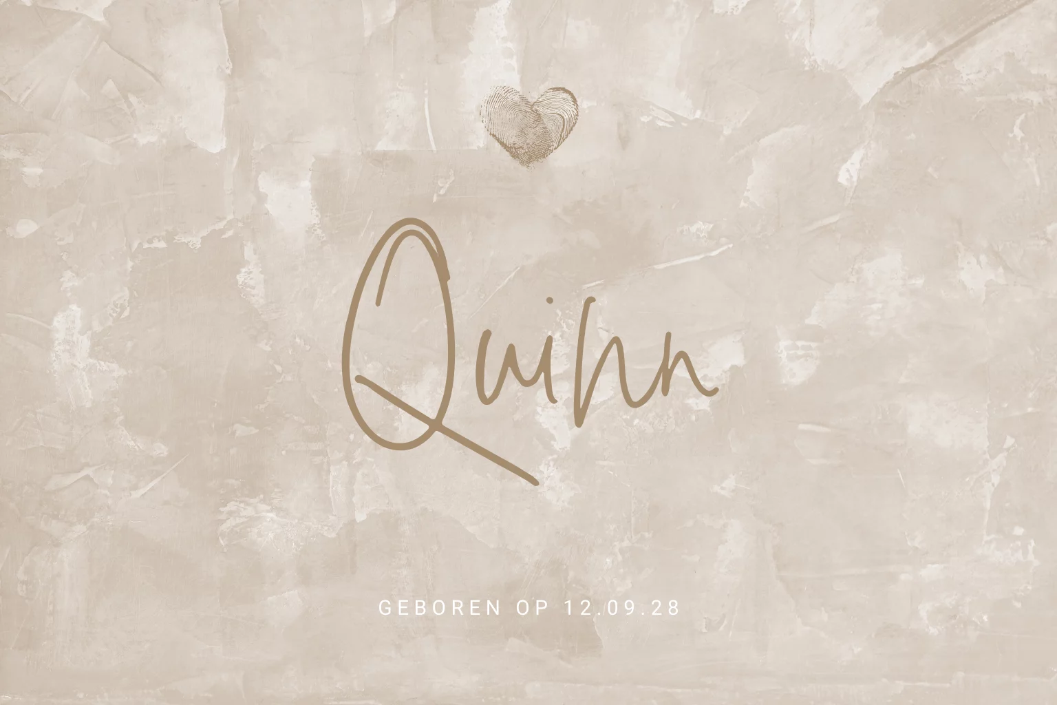 Unisex geboortekaartje in de stijl van het geboortekaartje van de zoon van Anne Vedder. Dit gender neutrale geboortekaartje Quinn met fingerprint hartje is een prachtige keuze voor de aankondiging van de geboorte van een jongen of meisje. De betonlook achtergrond in een trendy beige kleur geeft een ware uitstraling aan het kaartje. Bijzonder is het samenkomen van twee vingerafdrukken die een samen een hartje vormen. Met zijn tijdloze uitstraling en afgeronde hoeken zal dit kaartje zeker indruk maken op jullie vrienden en familie. De toevoeging van de envelop in de kleur zand en de bijpassende sluitzegel maakt het geheel compleet.