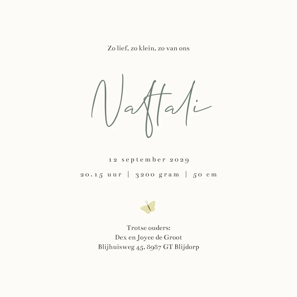 Lief unisex geboortekaartje met schaapjes en bloemetjes. Op dit nude geboortekaartje zie je een illustratie van twee schapen met een lammetje. Dit rustige geboortekaartje Naftali is zowel geschikt voor een jongen als meisje en kun je naar eigen smaak aanpassen in de editor. Hulp nodig? We helpen graag!