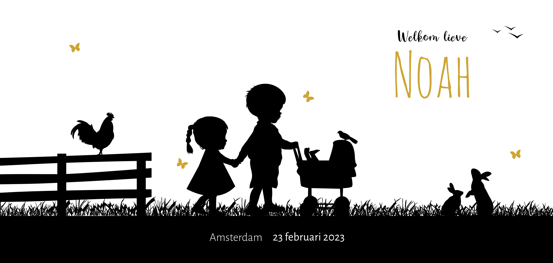 Geboortekaartje voor een derde kindje samen met een grote broer en grote zus. De baby ligt in een wandelwagen of wieg. De drie kindjes staan op het gras tussen een paar Hollandse boerderij dieren, zoals een haan, konijntjes en een vogel. Geboortekaartje Noah is een gender neutraal unisex kaartje en het ontwerp is niet moeilijk aan te passen.