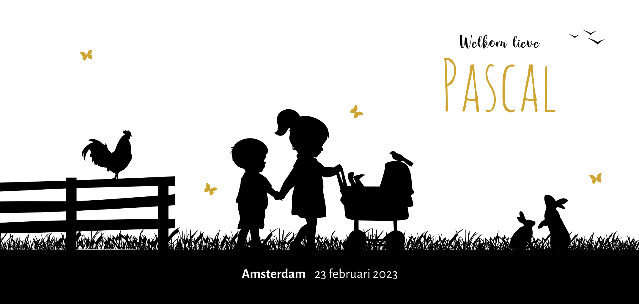 Silhouet geboortekaartje met boerderij dieren voor een derde kindje. Op dit silhouet geboortekaartje Pascal staan konijntjes en een haan op een boeren hek. De kaart is gender neutraal en daardoor geschikt voor een baby zusje en baby broertje. Verder staan er op dit unisex babykaartje een grote zus en een grote broer.